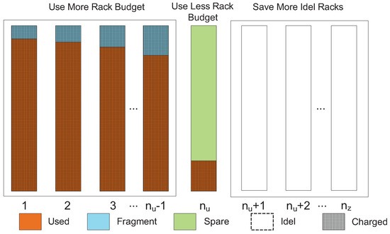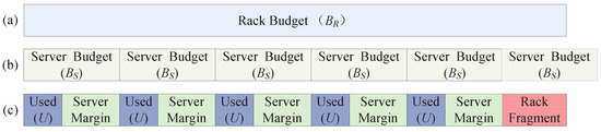 In essence, the server’s power margin is caused by the over-provisioning of power, while the power fragment of the rack derives from the irrational server arrangement on the rack. Idle power can be mined from in Equation (1). The rack utilization in Equation (2) can be promoted by reducing the server’s power margin and the rack’s power fragment of :