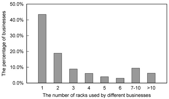 In the Tencent network, there are over 4700 kinds of businesses deployed in dedicated servers. The number of racks used by each business in one machine room are shown in Figure 4. The number of racks used by more than 90% businesses is within 10, and that used by over 80% businesses does not exceed 5. Therefore, when optimizing the original server placement strategy, an integer between 5 and 10 can be used as the number of racks , and the number of existing servers inside these racks can be used as .