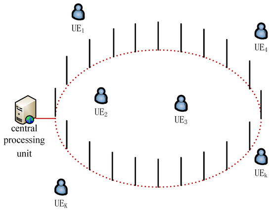 Similarly to [26], we consider the uplink of the single-cell multi-user massive MIMO system as shown in Figure 1, where the BS is equipped with large-scale antennas located on a circle with radius r. The BS equipped with N antennas serves K single-antenna UEs with the same time frequency resource. On one hand, the path-loss fading can be effectively reduced by the distributed antennas. On the other hand, it is more easy to connect the circularly located BS antennas by optical fibres. Similarly to [9], we assume that . All antennas connect with central processing unit through high-speed fiber. The channel fading keeps invariant in one time block, but changes independently from one block to another. We assume that the perfect channel state information is available at the BS by reciprocity in the time division duplex system. Based on the perfect CSI available at the BS, ZF linear technique is used to detect the data from the UEs.