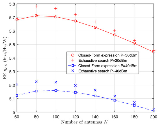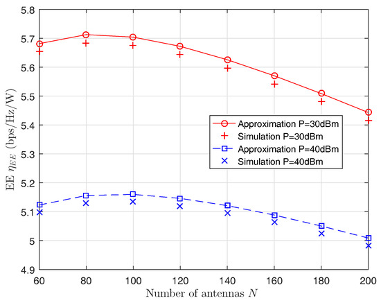 Figure 2 shows the EE versus the number of antennas. The graph indicates that EE is concave with the number of antennas. In addition, the derived closed-form expressions are in agreement with the simulation results.
