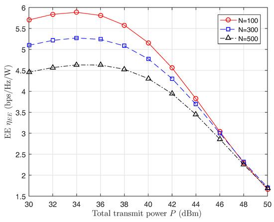 It can be observed from Theorem 2 that the optimal that maximizes the EE for different P and N is the same, so is also the optimal solution of .
