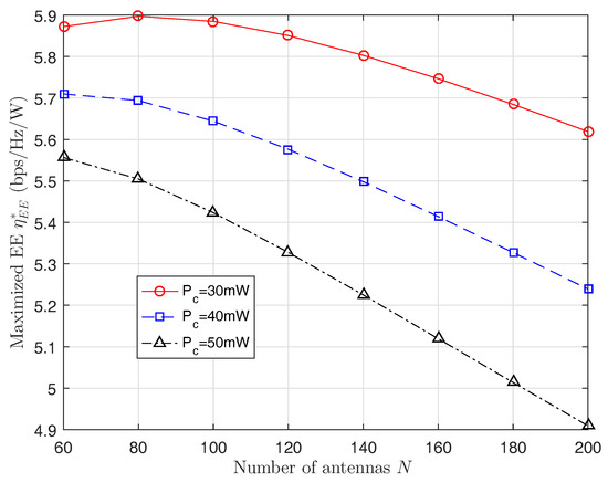 It can be seen from (12) that the EE is a function w.r.t. the number of antennas, the total transmit power, and the power allocation coefficients. In this section, we aim to determine the optimal system parameters N, P, and . The optimization problem can be formulated as