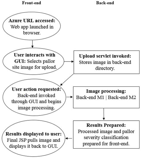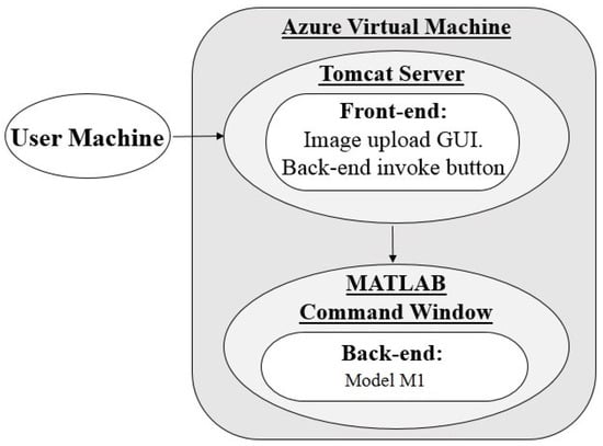 The POC application hosted using architecture 1 consists of a Java front-end and a MATLAB back-end (model ). Its use relies on user access to an instance of MATLAB to run the application back-end for pallor screening results. When the application URL is accessed from a browser, as seen in Figure 3, the front-end is launched on a tomcat server which is ported to the Azure VM being accessed and includes an existing installation of MATLAB and all back-end algorithm components pre-loaded to the workspace. This allows for user-hardware independent processing since local user machines do not need a MATLAB installation. Users are able to use the front-end interface to upload their images to the VM and begin image processing by running MATLAB scripts with PowerShell. Upon completion, results are collected by the front-end to be displayed on the graphical user interface (GUI).All materials related to the uploading, processing, and results produced are saved on the VM disk, providing us with a temporary location in the cloud for data handling.