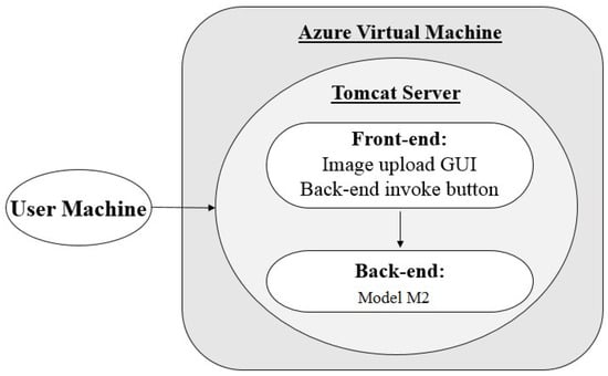 The POC application hosted using architecture 2 consists of a Java front and back-end (model ) located within one package, and requires no external processing environment outside of the tomcat server and Java runtime environment. The application is hosted in an Azure VM, as described in Section 3.1. When the URL is accessed from a browser, as seen in Figure 4, the web application is launched and run using a tomcat server framework. From here, users can use the front-end GUI to upload their images and then run a Java servlet to begin processing.