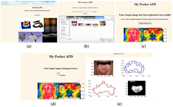 Sample webpages.(a) GUI welcome page; (b) User uploading tongue image; (c) User invoking back-end from webpage button; (d) Web page displaying spinner as back-end runs silently; (e) Final results displayed back to GUI.