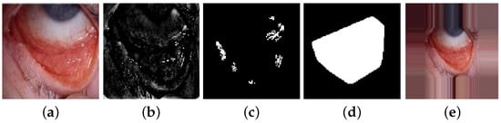 Steps for pallor-site image pre-processing; (a) original image; (b) ; (c) ; (d) mask g; (e) padded image.