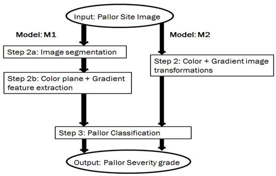 Based on the variabilities introduced by the data sets, two data models (, ) are analyzed for pallor severity index classification tasks. These 3-step data models are shown in Figure 8 and described as follows. The first model () detects specific spatial ROIs, indicative of patient pallor, followed by extraction of pixel intensity features corresponding to color plane and gradient images within the ROIs. Next, the features extracted from test images are utilized for pallor grade classification.