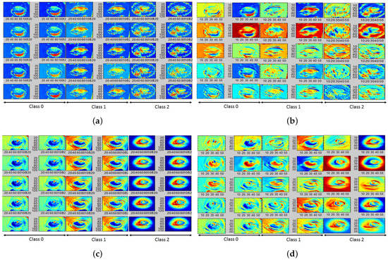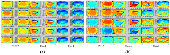 For the tongue data set, 8 color planes extrapolated by gradient filtering and superposition on the red, green, blue, lightness and a,b planes (from Lab transformation), luminance and chrominance planes (Ycb transformation) are found to have the maximum classification accuracies in the range [62–65%]. Here, the lightness () and a-plane () are found to have the highest classification accuracies. Further, the top 20 significant AFMs from the trained CNN models for the color planes are qualitatively analyzed for data separability. For the tongue images in Figure 1b, the corresponding AFMs for the are shown Figure 10, respectively. Here, we observe that for normal images (class 0), the inner tongue region is more flushed than the outer tongue regions. Images with anemia (class 1) have homogeneously flushed full tongue regions, while abnormal images (class 2) have structural variabilities in the inner segments of the tongue. Besides, covariance/correlation analysis of the model features with the output class labels demonstrate that gradient-filtered features have the highest correlation indices. Thus, the importance of skin-independent ROIs for pallor classification tasks is qualitatively demonstrated by the CNN model AFMs with unmasked images.