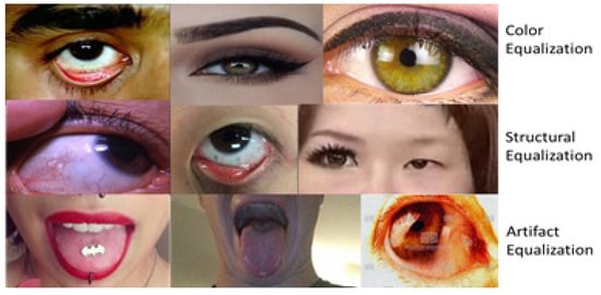 With the two proposed hardware-independent non-invasive medical diagnostics screening platforms, users will be able to dictate their use based on preferences for speed versus accuracy in screening results. The application with back-end, which provides more accurate pallor screening at slower processing speeds due to ROI segmentation requirements, is optimal for longitudinal assessment of personalized pallor. However, the application with the back-end, which provides slightly less accurate results at faster processing speeds, becomes preferable for large-scale screening applications. Future works can be directed towards extracting pallor-specific bio-markers from patient skin-color based features. To counteract the variations in patient demographics, the image processing modules that need to be developed include normalized feature extractors with color, structural and artifact equalization modules as shown in Figure 11. The functionalities of these modules may be directed towards spatial transformations against variations in image illumination, camera pixel resolutions, and facial piercings. Such skin-based pallor classification will necessitate texture-based feature detection modules with higher time complexities followed by combination of pallor-specific bio-markers that are independent of patient ethnicity, gender and age-based variations.