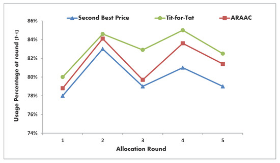 To evaluate these assumptions, Figure 1, Figure 2 and Figure 3 present the performance outcomes when the aforementioned three mechanisms (ARAAC, Tit-for-Tat, and SBP) were deployed in the conducted simulation environment. Figure 1 shows the resource utilization rates of five different auction rounds, t, labeled on the time axis from 1 to 5. Analyzing the figure, we can conclude that the Tit-for-Tat mechanism scored the highest records, while the SBP scored the lowest. This was predictable; indeed, the Tit-for-Tat mechanism is very selective when it comes to the bidders’ behavior in the last won auction round, and it only accepts those bidders with a positive behavioral record. Thus it results in high utilization rates. On the contrary, the SBP does not show any attention to the bidders behavior but for the offered price-units which justifies the low scores it provided. When it comes to ARAAC, the offered price-units and the bidders’ behavior are both important, however, the behavior here is accumulative. Therefore, if compared to the other two mechanism, ARAAC shows an intermediate score at the first few rounds, and with the time, it begins to approach the Tit-for-Tat rates as its behavioral policy prevails and the tenants’ behavior becomes more mature.