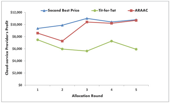 In Figure 2, we show the resulting profit values for the cloud-DCN providers at the five auction rounds labeled on the time axis from 1 to 5. Analyzing the figure, we can easily notice that the Tit-for-Tat mechanism earned the lowest profits, while it was clearly higher for the SBP which seeks only the high bid offers. Intuitively, adopting a mechanism that selects the bidders according to their behavioral records regardless of their offered price-units provides no guarantees of profit maximization. In turn, the SBP won the maximum profits in almost all the auction rounds. This is also intuitive, as it seeks for the bids with the highest offered price-units no matter their behavioral records. At the first few rounds, ARAAC earnings were averagely between those of the other two mechanisms. However, at rounds 4 and 5, ARAAC showed close results to those of the SBP. This agrees with our claim that ARAAC provides for an incentive compatible allocation model. Indeed, as the time continued, ARAAC’s behavior-based selection policy prevailed, and thus, it motivated those rational bidders who wanted to win the allocation auctions to adapt their behavior accordingly.