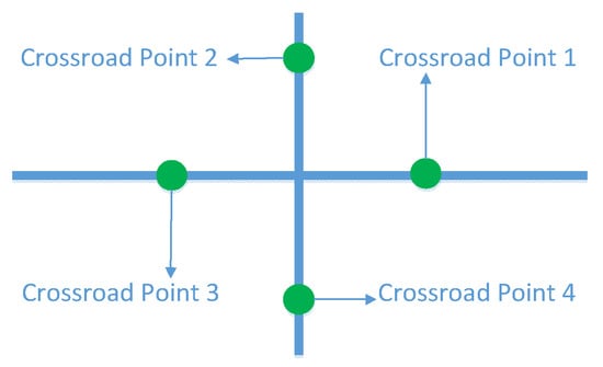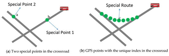 The mapping rules mainly contain two parts: the road (edge) and the point (junction) in Figure 4. All roads should be mapped by a straight line, and these roads are made up of a start point and an end point, and contain no break points. So, the roads’ lengths are between [5 m, 50 m]).We need to build two GPS databases, comprising a GIS database and a special route database. The GIS database stores the general road GPS data (road network information), and the special route database stores the GPS data of the route in the intersection in Figure 5.