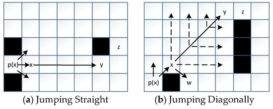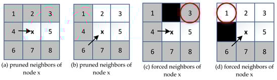 Node x is currently being expanded in Figure 9. In both cases, we can immediately prune all grey neighbors, which can reach optimally from the parent of x without ever going through node x. The arrow indicates the direction of travel from its parent, either straight or diagonal. Node x is expanded currently. The arrow indicates the direction of travel from its parent, either straight or diagonal. Note that when x is adjacent to an obstacle, the highlighted neighbors cannot be pruned in Figure 9; any alternative optimal path, from the parent of x to each of these nodes, is blocked. When you check for a node on the right of the current node of black arrow in Figure 9a,b, you should only add the node immediately to the right of the current node. For diagonal movement, we basically use the same rules as for horizontal movement, only when we move diagonal, we also check the nodes horizontally and vertically, so we are able to find a corner situation where a forced neighbor is added to the open list, or if we find our destination node in the red circle in Figure 9c,d.
