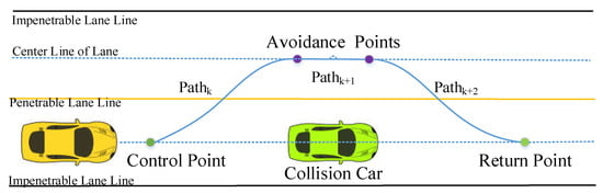 A new trajectory is generated by Bezier curves; the current position of the vehicle, the control points, the avoidance points, and the return points are selected from the existing path. If the left lane turns to impassability, it means no avoidance point can be detected. Thus, a new trajectory is planned from the control point to a safe position in front of the collision car.