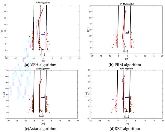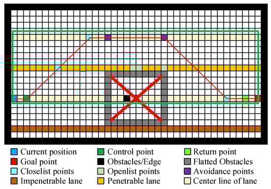 The path is generated from the current position to the goal point, its performances are shown in Figure 12. A vehicle is searched by JPS for a new path to avoid collision area. According to collision avoiding rule, it is indicated by a red “x” in Figure 12. The new path is determined by expanded points (open-list/close-list points); it attempts to overtake or change lane in the structured urban environment.