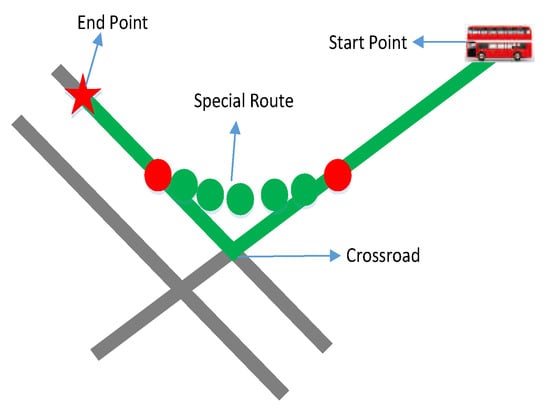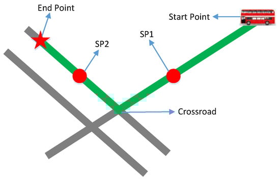 By reading SP1 and SP2 data, the unique index is worked out, and the special route database is searched to get a special route named the Curve Path. When the car arrives at SP1, the Curve Path (red line) take the place of the green line as its current path. Also, when it arrives at SP2, it continues to use the green line as its path until it drives to the destination in Figure 14.
