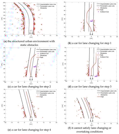 Figure 15a shows the experiment scene under the structured urban environment with static obstacles along the road by laser rangefinder. The black solid lines in Figure 15 represent lane lines, and the car is hard to cross, while black dash lines represents the passable lane line. The car could achieve lane changing and overtaking in Figure 15b. Figure 15c–e describes behaviors of lane changing and overtaking in the case of collision car (purple triangle) detection at the same lane. The driverless car generates a feasible trajectory to follow the local path planning as a red solid line in Figure 15. If it cannot satisfy lane changing and overtaking conditions, then the driverless car performances are shown in Figure 15f. Thus, it is verified that the proposed path planning method is effective.