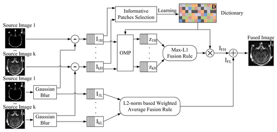 If the high-low image components are not decomposed, “Max-L1” used for fusing sparse coefficients may select the wrong coefficients and cause an error in the fused image [24]. The decomposition of high-low image components was used by Liu in image fusion. Source images were decomposed into high-low frequency image components, when he did sparse-representation based image fusion [27].