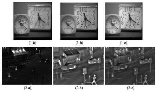 Multi-focus and Infrared-visible Image Fusion Results of Proposed Solution, (1-a) and (1-b) are the multi-focus source images, (1-c) is the fused image by our proposed solution, (2-a) and (2-b) are the infrared-visible source images, and (2-c) is is the fused image by our proposed solution.