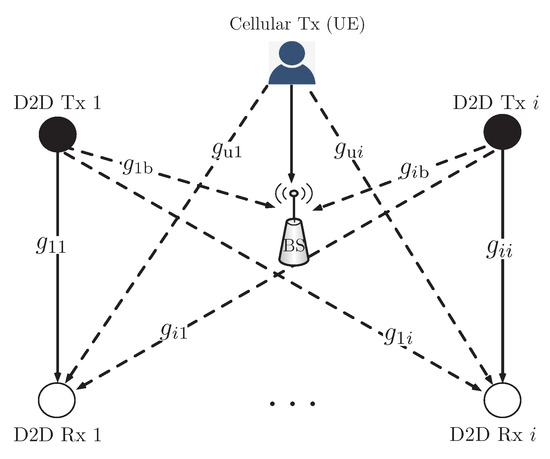 where is a transmit power-to-noise ratio of D2D transmitters, hereafter simply called SNR. Then, the signal to noise plus interference (SINR) received at a D2D receiver i, denoted by , can be calculated as