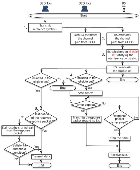 - All D2D transmitters can receive the response packet transmitted by the receiver in Step 5. The D2D transmitter can transmit its data, but each D2D transmitter included in checks the following condition:where can be obtained by measuring the response packet transmitted by receiver , and is a threshold value required in the proposed scheme. All other D2D receivers except stop their timers right after receiving the response packet from .