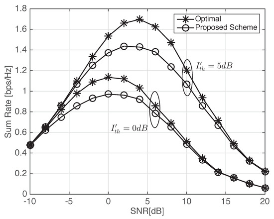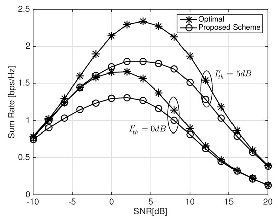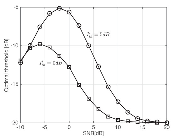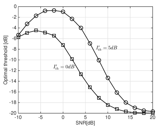 Figure 5 and Figure 6 show the optimal threshold values to maximize the average sum-rates of the proposed scheme with the same parameter values with Figure 3 and Figure 4, respectively. As the SNR of D2D transmitters increases to a moderate level, the optimal threshold value increases and thus decreases. The optimal threshold value of the proposed scheme decreases if the SNR increases above the moderate level. The excessively high SNR above the moderate level seriously decrease and thus a low threshold can enhance the performance of the proposed scheme by increasing .