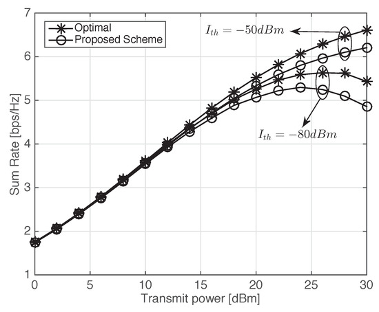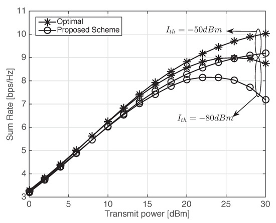 In Figure 7 and Figure 8, we analyze the average sum-rates of the proposed scheme when channels are non-i.i.d. to verify the feasibility of the proposed scheme in practical environments. Table 2 summarizes the average sum-rates of the proposed and optimal schemes and the ratios of average sum-rate obtained by the proposed scheme to optimal value. D2D nodes are uniformly distributed in a circle with a radius of 200 m and a cellular BS is located at the center of the circle. The average channel gain between transmitter i and receiver j is determined by , where −30 dB and denote a minimum coupling loss and the distance between transmitter i and receiver j, respectively, and , . It is assumed that the channel bandwidth is 10 MHz and thermal noise power density is −174 dBm/Hz. The transmit power of all transmitters varies from 0–30 dBm and or −80 dBm. The performance gap between the proposed and optimal schemes is noticeably reduced in the entire SNR region, compared to the i.i.d. channel environments. It is shown that the average sum-rates of the proposed scheme approach the optimal values for entire SNR values and they are almost optimal in a practical region of SNR such as 0–20 dBm.