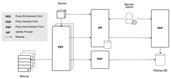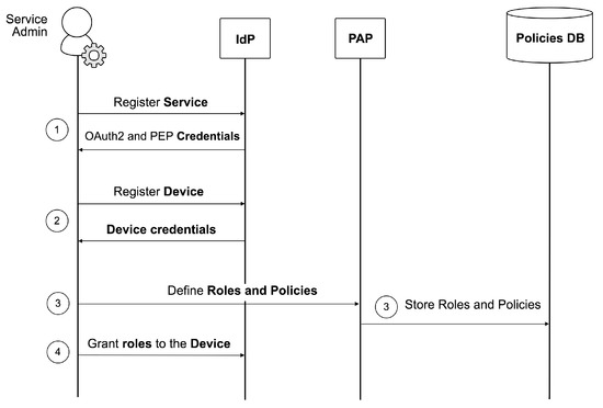 The Service Admin and the Device need to be registered in the IdP, so that they get a set of credentials (usually a username and a password), which they can use to authenticate and identify themselves against the AC system. Additionally, the IdP could also provide identity to other users of the application, following an Identity as a Service (IDaaS) approach [24,25].