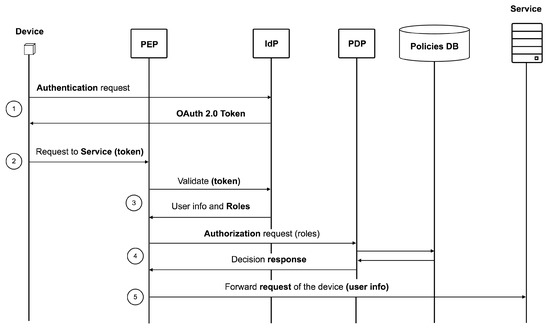 - If the PDP has denied the access, the PEP will finally send an Unauthorized response to the Device. Otherwise, it will forward the request of the Device to the Service, including the public information, which was previously obtained from the IdP. This information can be useful for the Service when performing the needed actions.
