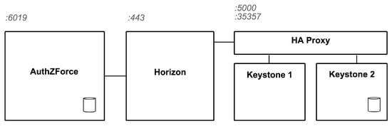 Figure 4 shows in detail the deployment in which the experiments exposed in this paper have been performed. Table 1 describes the hardware used to deploy each component. As explained before, the IdP is based on Openstack and therefore split into two components, Horizon and Keystone, for the front-end and the back-end, respectively. In order to provide a high availability solution, we deployed two instances of Keystone, which is the module that handles a higher number of requests. Both of them are connected to the same MySQL database, hosted in the Keystone 2 instance. An external disk is mounted in this instance, in order to store the data that are periodically backed-up from the database. The High Availability (HA) proxy just redirects the incoming requests to one of the Keystone instances. Finally, the Policies DB is hosted in the same instance where the AuthZForce component is running. The figure also shows the public ports exposed by each component.