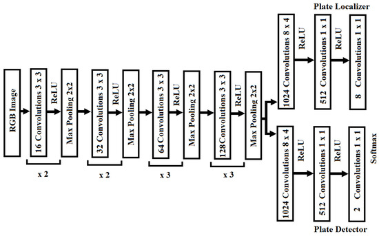 First of all, the input image is resized as shown in Figure 6. The flow of the trained neural architecture discussed in Section 3 is simplified by rescaling the input image (128 × 64) to allow for a single license plate classification per image. Then, the plate classification (detection and localization) is performed to find the position of the plate inside the input image, if a plate is detected. This network is composed of 16 convolutional layers. The first 10 convolutional layers of this network provide shared connections for simultaneous plate detection and localization, as shown in Figure 1. The remaining six layers are for either the plate detection or localization (three layers for each task). The plate detector has two outputs, defining the detection of a plate or no plate, while the output of the localizer consists of eight values that represent the x- and y-coordinates of the four points that enclose the plate.