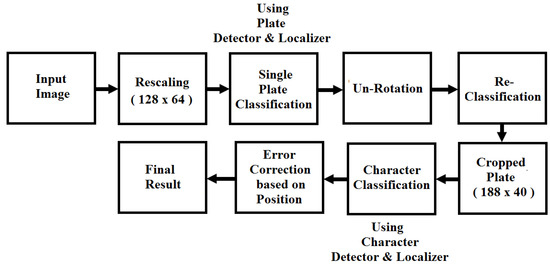 Flow of the realized architecture is shown in in Figure 4. The trained network for plate detection is implemented in its original form, to accurately localize a single vehicle license plate in a real-time complex scene. The trainable parameters are reduced to float from double datatype to improve performance and reduce memory consumption; the accuracy of plate detection remains the same as the source network on the test set. Since the complete network for plate and character recognition is complex and requires multiple classifications that can be time and memory consuming on an embedded device, the flow of the original network is simplified by sacrificing some recognition performance. A new block of error correction is added in the simplified flow in order to increase the classification accuracy.