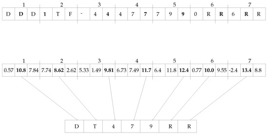 A generic Italian license plate contains seven characters (three digits and four alphabetic characters). This simplified ALPR system must select seven characters from the 21 outputs (classifications) generated by the network. To generate the final result, a trivial heuristic approach is adopted in the proposed flow. This heuristic method divides the 21 classifications (slots) into seven small clusters composed of three slots each. Note that the slots are overlapping, and depending on the accuracy of the plate localization, the same slot is not always the most centered. The classification corresponding to the highest confidence rating within each cluster is selected for the final result, as shown in Figure 7.