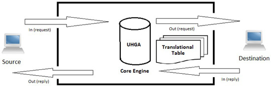 Whenever an internal host requests a connection (or sends an IP packet) destined to an external Host B, the packet is received by the ingress link of the black box. Based on the source, destination and the current time, the UHGA algorithm will generate and replace the original TCP/IP header fields. Other application layer fields are kept intact. The source information, including the original TCP/IP fields are copied to the same row as in the incoming packet at the Egress-column and the packet is transmitted through the outside (egress) link. Once the reply packet is received, the reverse of ingress–egress entry is used to relay the reply to the inside host. This process is similar to a Socks-proxy server. However, the main difference is that the SDMw system rewrites the entire protocol header fields to pretend as if the machine is using a certain OS.