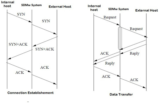 For connectionless UDP and IP packets, it is not necessary for the SDMw system to use the in–out table. However, for TCP connection, the system must maintain the in–out table for forwarding purposes. Figure 2 depicts the operation of the SDMw system when using a TCP connection. This process is similar to TCP-intercept or a Socks proxy server.