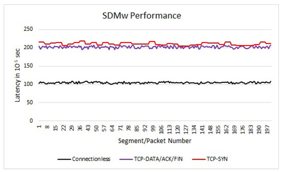 We collected statistics for 200 ICMP packets (100 from each host) and 200 TCP-DATA/ACK/FIN segments. We also collected the latency associated with TCP-SYN segments associated with the data connection. The performance graph is presented in Figure 4. As it can be seen from the performance graph, the SDMw system did not introduce considerable latency due to the header rewriting process. For TCP-DATA/ACK/FIN segments, the average latency is about 2.2 ms. For the associated TCP-SYN segments, the latency is 2.3 ms. For connectionless ICMP packets, the latency is 1.1 ms. The latency can be improved if we run the SDMw algorithm in an application-specific integrated circuit (ASIC) processor with highspeed content addressable memory.