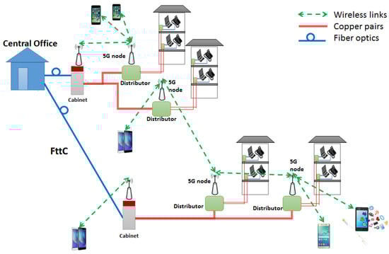 Wireless fronthaul/backhaul is being analyzed in the current literature. Several solutions mostly based on millimeter waves have been considered. Due to their inherent flexibility, the adoption of radio technologies possibly integrated with optical fiber for 5G fronthauling and backhauling such as satellite, WiFi, or cellular systems are currently under study [13,14]. In this paper we investigate on the possibility of using fiber to the cabinet (FttC)-based fronthaul. The adoption of DSL (Digital Subscriber Line)-based technologies for fronthauling has been mainly discussed with respect to the fiber to the distribution point (FttDp) access network topology using G.fast (ITU-T G9701) or the future X-G.fast [15]. CAPEX investments for an FttDp deployment can be compared with those based on optical fiber and the adoption of G.fast technology is still at initial stage and in some Countries (such as Italy) it is slowed down by regulatory issues related to the access market. To the best of authors’ knowledge, the possible adoption of FttC networks based on Very High-speed Digital Subscriber Line type 2 (VDSL2) profile 35b [16] has not been thoroughly analyzed and investigated in the current literature and considerations have been restricted to the current FttC networks based on VDSL2 profile 17a. The introduction of the VDSL2 profile 35b is relatively recent and its potentials for fronthauling have not been adequately explored especially for supporting of 5G. Telecom operators have started to invest on VDSL2 35b and are currently updating their access network with this new technology. The enlarged bandwidth of 35b, the adoption of vectoring with the possibility of bonding more copper pairs and with phantom technology allowing combining pairs to electrically increase the overall number of pairs at the network termination (NT), allow to extend the VDSL coverage and to obtain significant bit rates that, as shown in this paper, can be used for fronthaul transport.