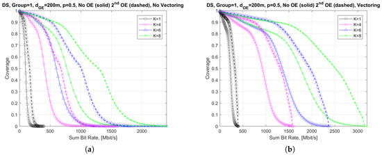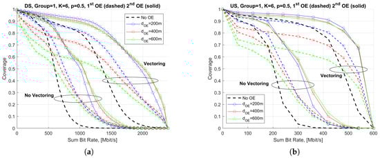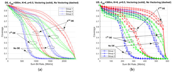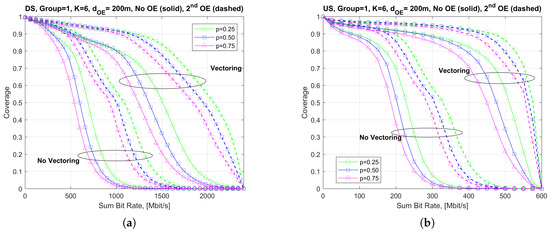 In Figure 6a,b we report the sum bit rate coverage for group 1 and the other two groups for DS direction and US direction, respectively. We have considered copper pairs per node and m. Results in the vectoring case are indicated with solid lines and the results in the non-vectoring case with dashed lines.