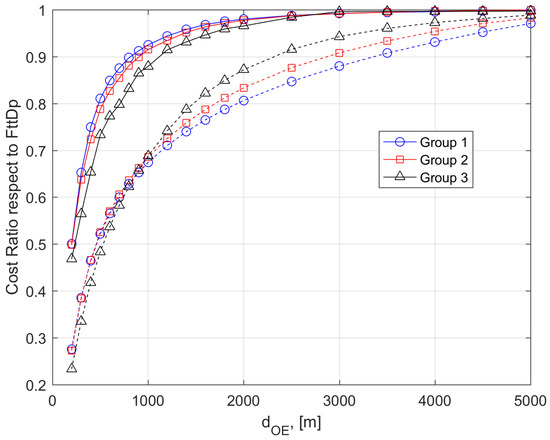 In both cases, costs tend to increase with since they are dominated by the digging costs for the optical fiber deployment. With the increase of , costs of the evolved FttC network tend to those corresponding to the all-fiber deployment. The first evolution strategy provides lower cost. However, looking for example at coverage results in Figure 5 cost saving is obtained at the expense of reduced coverage performance as compared with results obtained considering the second strategy for the same . In Figure 10 we observe an inversion of costs with . In particular, for small the costs of first strategy are higher for group 1 and group 2 with respect to group 3 and then the situation reverses with the increase of . The inversion of costs still holds for the second strategy even though it occurs for larger and it is not clearly visible in the Figure. The inversion can be explained considering that the distances of distributors in the group 3 are larger than those in the other groups (see Figure 3). Then, in the case of group 3 the possibility of installing a larger number of new Cabinets at longer distances is higher than for group 1 and group 2, thus leading to higher cost for group 3.