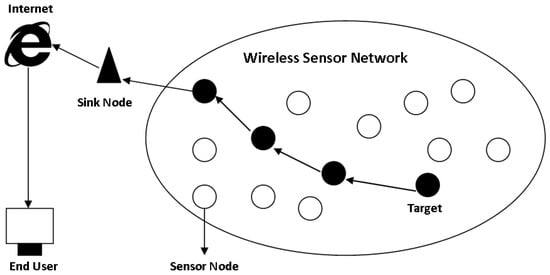 Wireless sensor network (WSN) is of the utmost importance in computer networking for the searching area and in information assortment. WSN finds its application in several areas, including monitoring and data storage. Due to rapid urbanization, the span of the applications of WSN has been increasing enormously. WSN has numerous sensors which are communicated via sending data from one sensor to another sensor in a wide area via packets. WSN is ubiquitously used in various fields such as military surveillance [3], the health care industry [4], and other industries [5]. The emergence of3rd millennium industries makes it interesting to research WSN. The actual implementation of WSN was started in 1950 and the US military used this technology. The first mature WSN was named the “Sound Surveillance System” (SOSUS). It was used to detect the threat of underwater submarines. Acoustic sensors (a type of sensor used to check the amplitude of the waves) are used for (SOSUS) and this technology is also being practiced nowadays [6]. Today, in every part of life,a sensor is used to detect sound, detect any kind of vibrations, check the water level, detect the temperature level [7], in smart houses [8], in smart phones, and most importantly, we use some kind of sensors in the human body [9]. The WSN consists of nodes, and through these nodes, sensors communicate with each other. The hierarchy of these nodes is like a star where every node connects to each other or like a mesh topology. Each node collects information from this sensor and communicates it to other nodes. A sensor node basically consists of a microcontroller, transceiver, external memory, power source,and one or more sensors. WSN consists of sensor nodes, a user, and an interconnected backbone. Figure 1 presents WSN Network architecture consisting of sensor nodes, which are used in environmental monitoring. In the context of wireless communication, the sensor nodes communicate with each other and send the processed data to the sink node. All the nodes send data to the sink node, which is further sent to users through the internet [10].