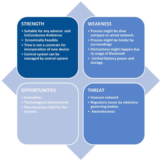The acronym of SWOT is Strength, Weakness, Opportunities, and Threat. SWOT is applied in this study to diagnose the merits and demerits of the real time application of the WSN. A WSN is ubiquitously applied in every aspect of daily life for its convenience in terms of intelligence and wireless networking such as smart and improved transportation systems. An attempt has been made in this paper to recognize the SWOT analysis for the real time application of the WSN. Furthermore, this kind of approach has not yet been performed by any researchers of this field. We have incorporated the analysis of SWOT in this study. Figure 9, presents an illustration of SWOT depicting the explanations.