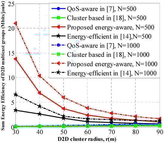 Figure 2 illustrates the sum energy efficiency of the D2D multicast cluster with the variation of the D2D cluster radius. From Figure 2 we can see that with the increase of the D2D cluster radius, the energy efficiency performance of our proposed scheme is better than other referenced schemes. This is because the channel gain of the D2D link will decrease with the increase of D2D cluster radius. Hence, a larger transmit power is required for the D2D clusters so as to satisfy the SINR threshold constraint. Accompanied with the increase of D2D cluster radius, our proposed scheme gradually increases the transmit power. This results in the decreased energy efficiency of the D2D cluster. Compared with the scheme in [14], our proposed resource allocation method minimizes the interference from CUs to co-channel D2D receivers, which improves the channel gain of D2D links. Furthermore, it is shown that when there are more UEs in the considered scenarios (N varies), the overall energy efficiency also increases due to the increased total transmission rate of all D2D multicast clusters.