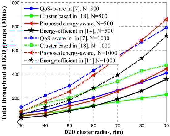 Figure 3 compares the total throughput of D2D multicast clusters of the proposed scheme with three other schemes. From the figure, we can see that the total throughput performance of the proposed scheme is initially inferior to that of [7] and gradually outperforms other schemes with the increase of D2D cluster radius. The reason is twofold. Firstly, our proposed scheme aims at maximizing the EE performance of the D2D clusters, which adopts a smaller transmit power when the radius of the D2D multicast group is small. This explains why the total throughput of our proposed scheme is smaller than that of the scheme in [7], which always adopts the maximum transmit power. However, with the increase of D2D cluster radius, our proposed scheme will gradually increase the transmit power of D2D users while decrease the transmit power of co-channel CUs in order to ensure reliable D2D multicast transmission, which leads to increased total throughput. Secondly, compared with schemes in [14,18], the resource relationship of our proposed scheme is based on minimizing the interference of D2D links. As a result, the CU who brings the least interference will be paired up with the D2D multicast cluster accordingly. This explains why our proposed scheme has better performance. Similarly, it is shown that the sum throughput of all four algorithms increases with the increase of user numbers.