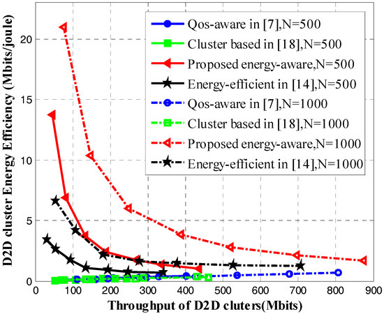 The impact of energy efficiency on total throughput of D2D multicast groups is shown in Figure 4. It can be observed that the energy efficiency performance of our proposed scheme and the scheme in [14] both decrease with the increase of total throughput. This is explained as when the total throughput increases, according to our proposed power control scheme, the transmit power also increases, which contributes to decreased energy efficiency. Moreover, based on minimizing the interference of D2D clusters, our proposed heuristic algorithm allocates better cellular resource to D2D clusters. Meanwhile, it also decreases the transmit power of co-channel CUs, which contributes to improved EE performance of D2D multicast clusters.