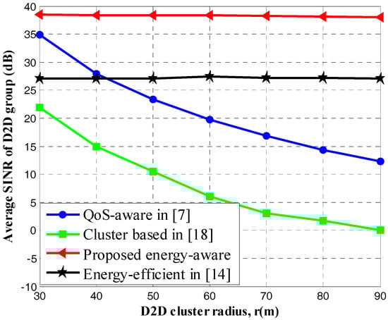 Figure 5 plots the average SINR of D2D multicast clusters with different D2D cluster radius. We assume that there are totally 500 UEs randomly distributed in the simulation area. From the figure, we can infer that for the schemes which include power control scheme, such as our proposed algorithm and the scheme in [14], the SINR distribution does not obviously decrease with the increase of D2D group radius. This is because according to the changing channel conditions and resource reuse relationships, the power control method jointly adjusts the transmission power of both D2D clusters and CUs, which ensures reliable D2D multicast transmission [19]. On the contrary, for the algorithms which do not incorporate power control schemes, such as [7,18], the QoS requirement of D2D multicast clusters in terms of minimum SINR constraint cannot be guaranteed when the channel quality becomes worse.