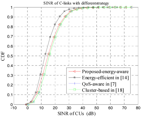 Figure 6 plots the Cumulative Distribution Function (CDF) curve of cellular users’ SINR concerning with different schemes. It can be obviously seen that with the introduction of power control scheme, the SINR curves of both [14] and our proposed scheme decrease, while the SINR curves of [7,18] are not severely impacted. This is because our proposed strategy decreases the transmit power of CUs in order to maximize the total energy-efficiency of D2D multicast clusters, which results in deterioration of CU’s SINR. However, compared with [14], our resource allocation strategy will pick up a CU who brings the least interference for the D2D multicast cluster. Hence, the co-channel interference caused by underlay D2D transmission will be effectively controlled, which contributes to improved SINR of C-links. From Figure 6, we can also infer that although the link quality of CUs has been affected a little for the proposed scheme. But the performance degradation is still acceptable to CUs because the power allocation strategy considers the minimum SINR constraint of different users.