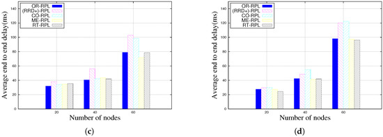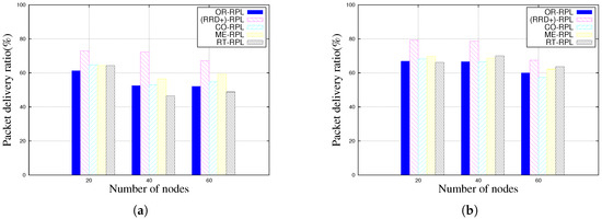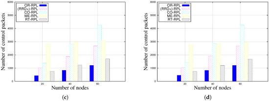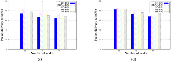 Figure 2 shows packet delivery ratio of different RPL variants based on different degrees of mobility. RRD+ outperforms other RPL and its enhancement protocols when the degree of mobility is above 25%. When the ratio of static nodes reaches 75%, RRD+ no longer has an advantage and is even outperformed by MR-RPL and RT-RPL in 60-node scenarios as shown in Figure 2d. This is mainly due to the fact that MR-RPL and RT-RPL have a mechanism to broadcast mobile nodes to other nodes in order to avoid being selected as next-hop nodes. Compared with mobile nodes, static nodes can offer more stable transmission paths. Therefore, MR-RPL and RT-RPL perform better when there are enough static nodes in the network to offer routes for the sink. On the other hand, MR-RPL and RT-RPL perform worse when there are not enough static nodes to chose from. Results also show that CO-RPL has limited contribution in mobility. This is mainly due to the fact that CO-RPL does not offer a method to update the C_ID value, which we already discussed in Section 3.