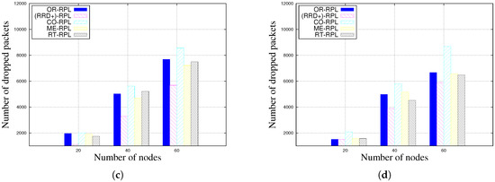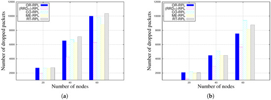 According to the IEEE 802.15.4 MAC (Medium Access Control) layer, nodes keep retransmitting frames until the number of retransmission attempts reaches a fixed maximum value after which the frame is dropped. The number of maximum retransmissions is three according to the standard. The number of dropped packets is the number of packets that are dropped after exceeding the maximum number of retransmission attempts. This evaluation metric shows how efficient the routing protocol is in finding a new parent when the link with the current parent is lost.