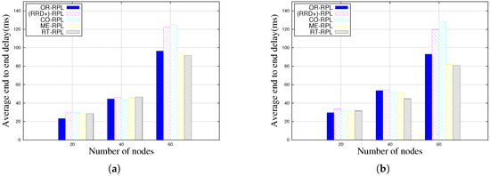 Figure 4 shows the average end-to-end delay of different RPL variants based on different degrees of mobility. The delay is computed on the delivered packets, lost packets do not appear in these results. The average end-to-end delay is computed according to the following equations.