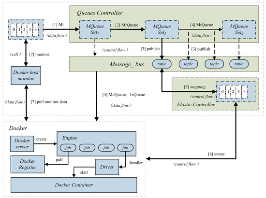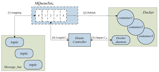 The container demand forecasting module provides a direct basis for elastic control. Elastic Controller components send the predicted value to the Docker daemon, the driver component controls the generation and closure of particular containers, then synchronizes the length and the number of MQueueSetk. Then according to the results of previous classification of message queues, MQueueSetk publishes messages to the micro-service and builds a mapping from the topic to the container. The elastic management model for cloud containers based on message scheduling is shown in Figure 3.